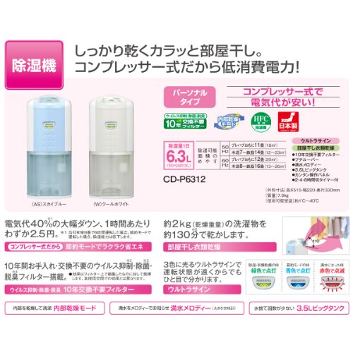 コロナ(CORONA) 除湿機 除湿量6.3L(木造7畳・コンクリート造14畳まで) 10年交換不要フィルター搭載 スカイブルー CD-P6312(AS)