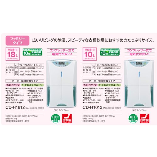 ◆広いリビングの除湿、スピーディな衣類乾燥におすすめのたっぷりサイズ◆約10年間交換不要フィルター◆運転状態がひと目でわかる「ウルトラサイン」・除湿方式:コンプレッサー方式・除湿能力(50/60hz):9.0l/日・10.0l/日・本体寸法:幅365×奥行270×高さ590mm・排水タンク容量:約6.2lで自動停止・冷風機能:なし・温風機能:あり / 【コンプレッサー方式除湿機について】お部屋の温度を下げることはできません。 (運転時の放熱により温度上昇がございます。)◆長所パワフルで除湿量が多い。 (特に室温の上昇する夏場に強い)消費電力が小さいため、電気代が安い。◆短所本体がやや大きく重く